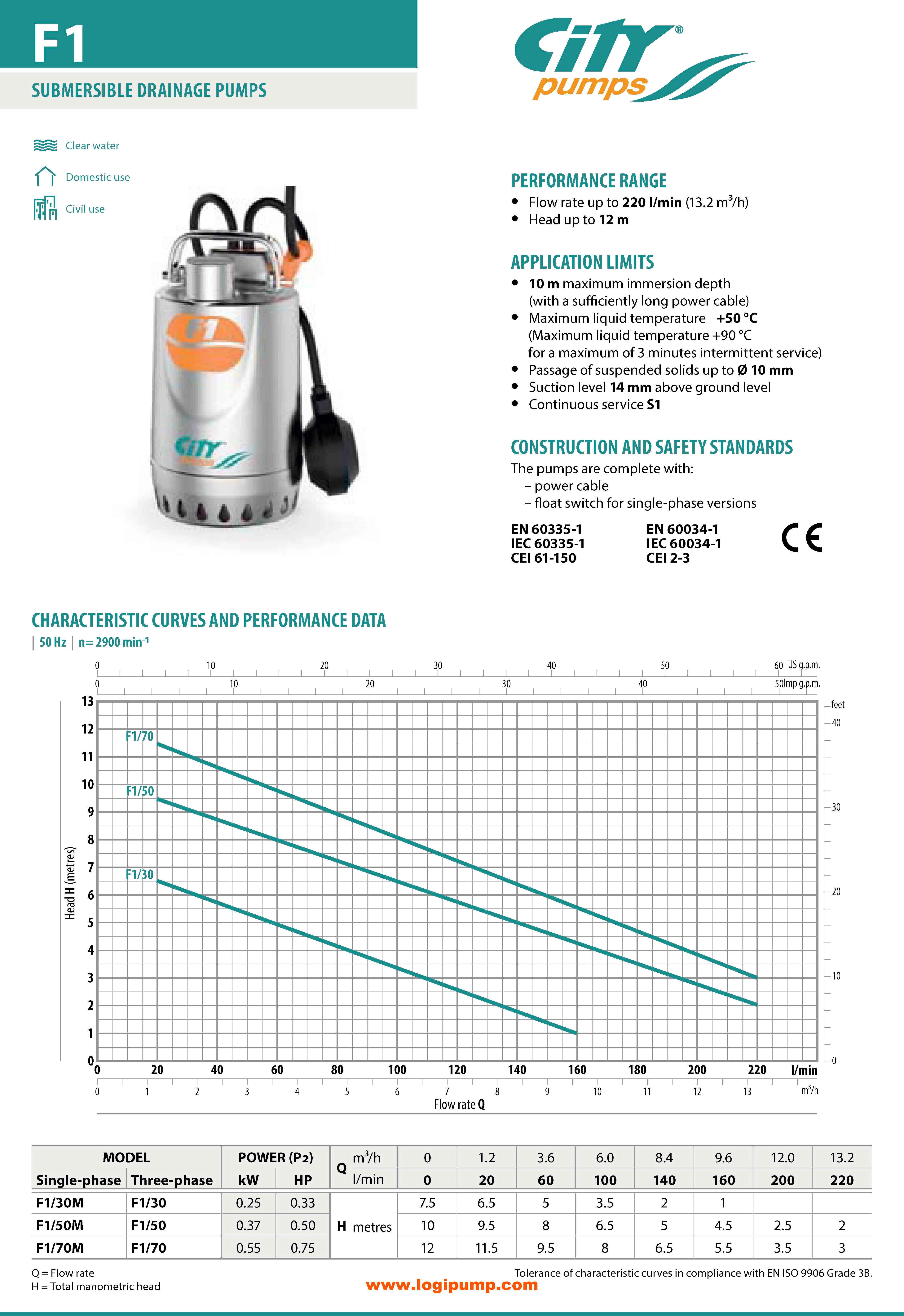 City Pumps F1/50 Paslanmaz Drenaj Pompası Temiz Su Tahliyesi İçin 0.37 kW - 10 mSS (CTY_F1/50)