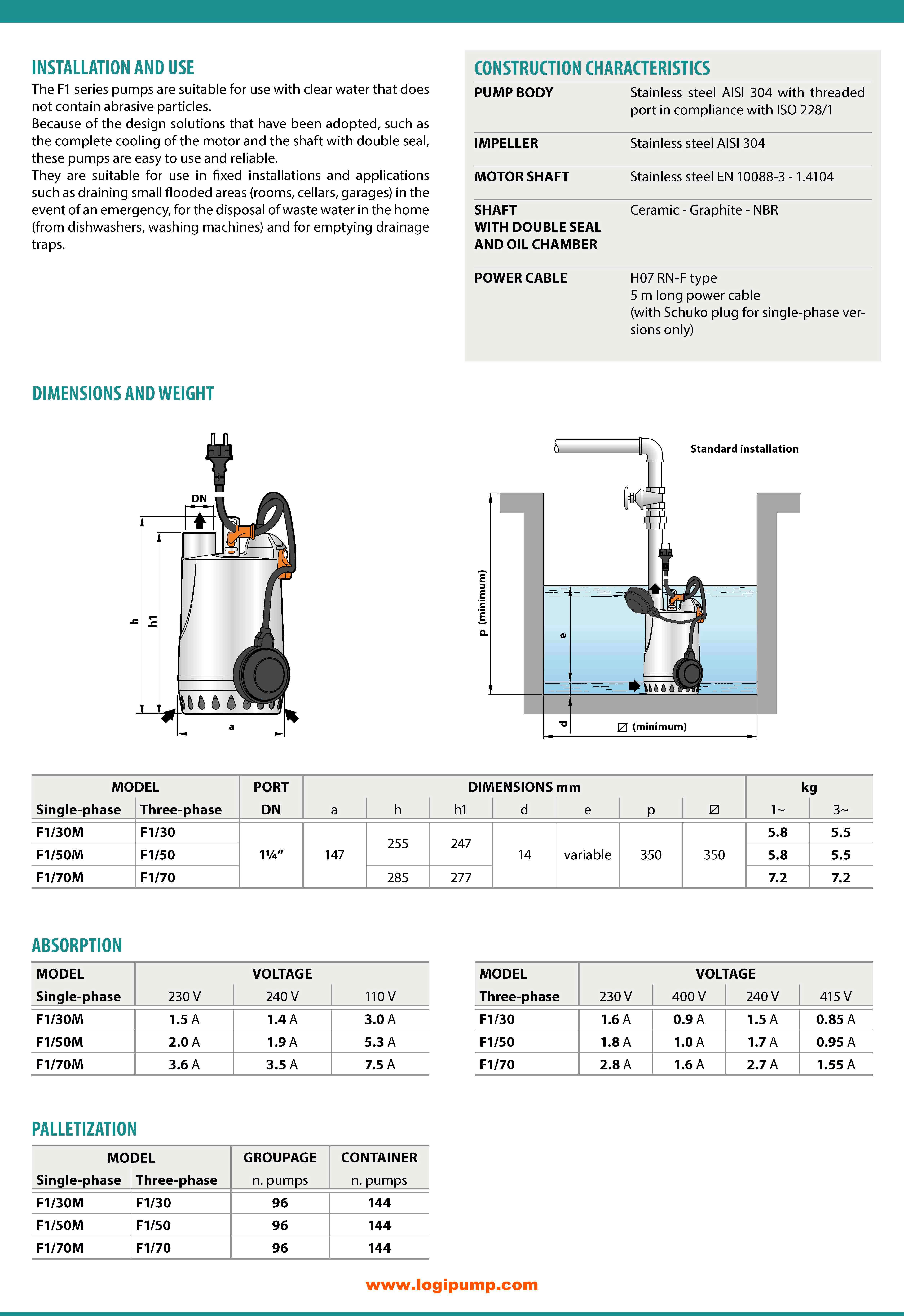 Paslanmaz dalgıç drenaj pompası. Temiz su. Debi 220 l/dk (13.2 m³/sa), basma yüksekliği 12 m. Daldırma derinliği 10 m, sıvı sıcaklığı +50°C. | CTY_F1/50: F1 paslanmaz drenaj pompası 13.2 m³/saat debi ve 12 m basma yüksekliğiyle havuz, garaj temiz su tahliyesi için dayanıklıdır. Made in İtaly | Pedrollo RX Serisi Alternatifidir 0.37 kW - 10 mSS