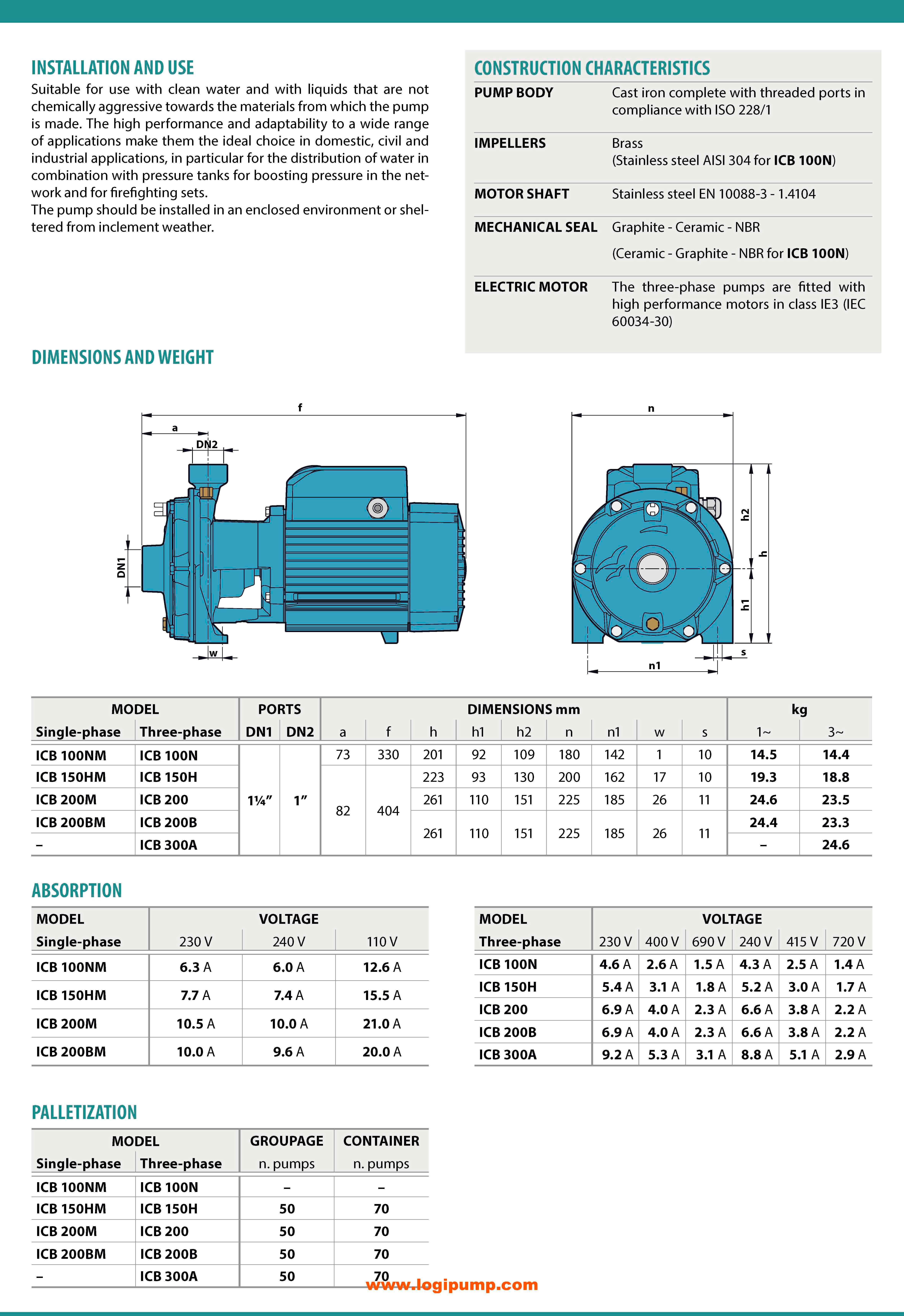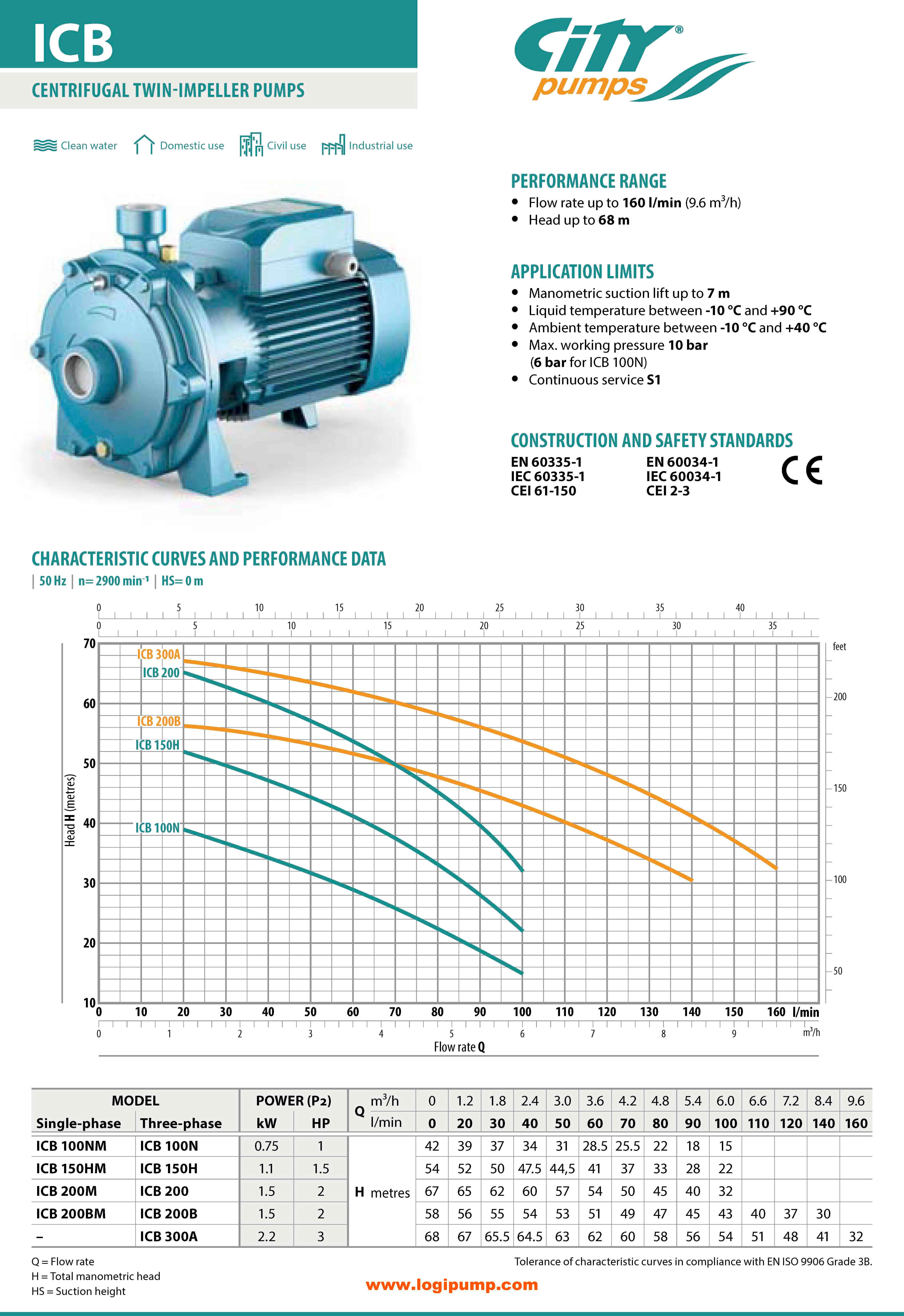 Çift çarklı santrifüj pompa. Temiz su için ev, sivil ve endüstriyel. Debi 160 l/dk (9.6 m³/sa), basma yüksekliği 68 m. Emiş yüksekliği 7 m, sıvı sıcaklığı -10°C ila +90°C. Döküm gövde, pirinç çarklar. | CTY_ICB 150H: ICB çift çarklı pompa 9.6 m³/saat debi ve 68 m basma yüksekliğiyle yüksek basınçlı hidrofor ve endüstriyel su sistemlerinde kullanılır. Made in İtaly | Pedrollo 2CP Serisi Alternatifidir 1.1 kW - 54 mSS