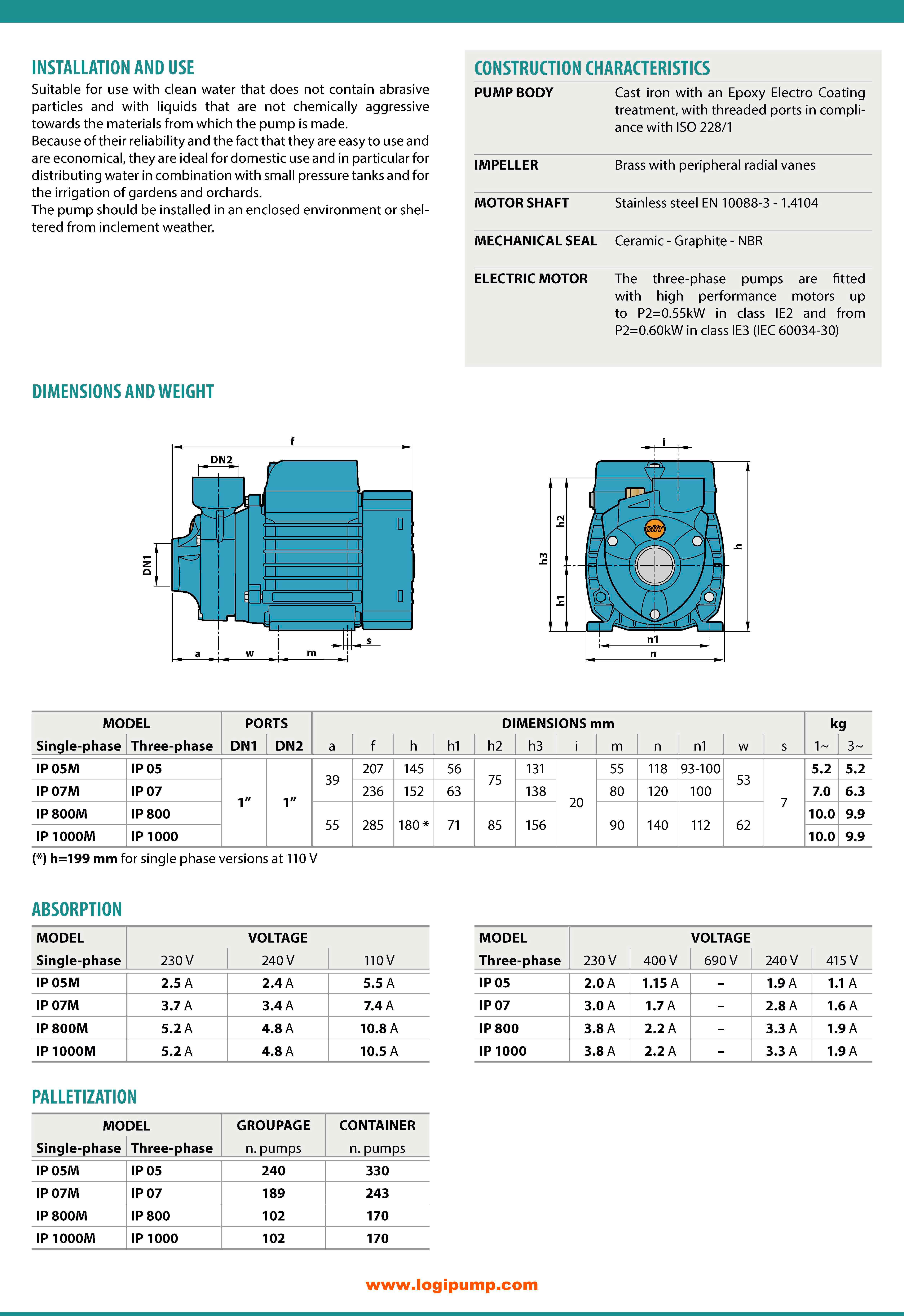 Periferik çarklı pompa serisi. Temiz su için ev tipi kullanım. Debi 50 l/dk (3 m³/sa), basma yüksekliği 70 m. Emiş yüksekliği 8 m, sıvı sıcaklığı -10°C ila +60°C. Döküm gövde, pirinç çark. | CTY_IP 800: IP serisi periferik pompa 3 m³/saat debi ve 70 metre basma yüksekliğiyle evde hidrofor sistemleri, bahçe sulama ve temiz su dağıtımı için ideal bir çözümdür. 8 metre emiş mesafesi sunar. Made in İtaly | Pedrollo PK Serisi Alternatifidir 0.60 kW - 65 mSS