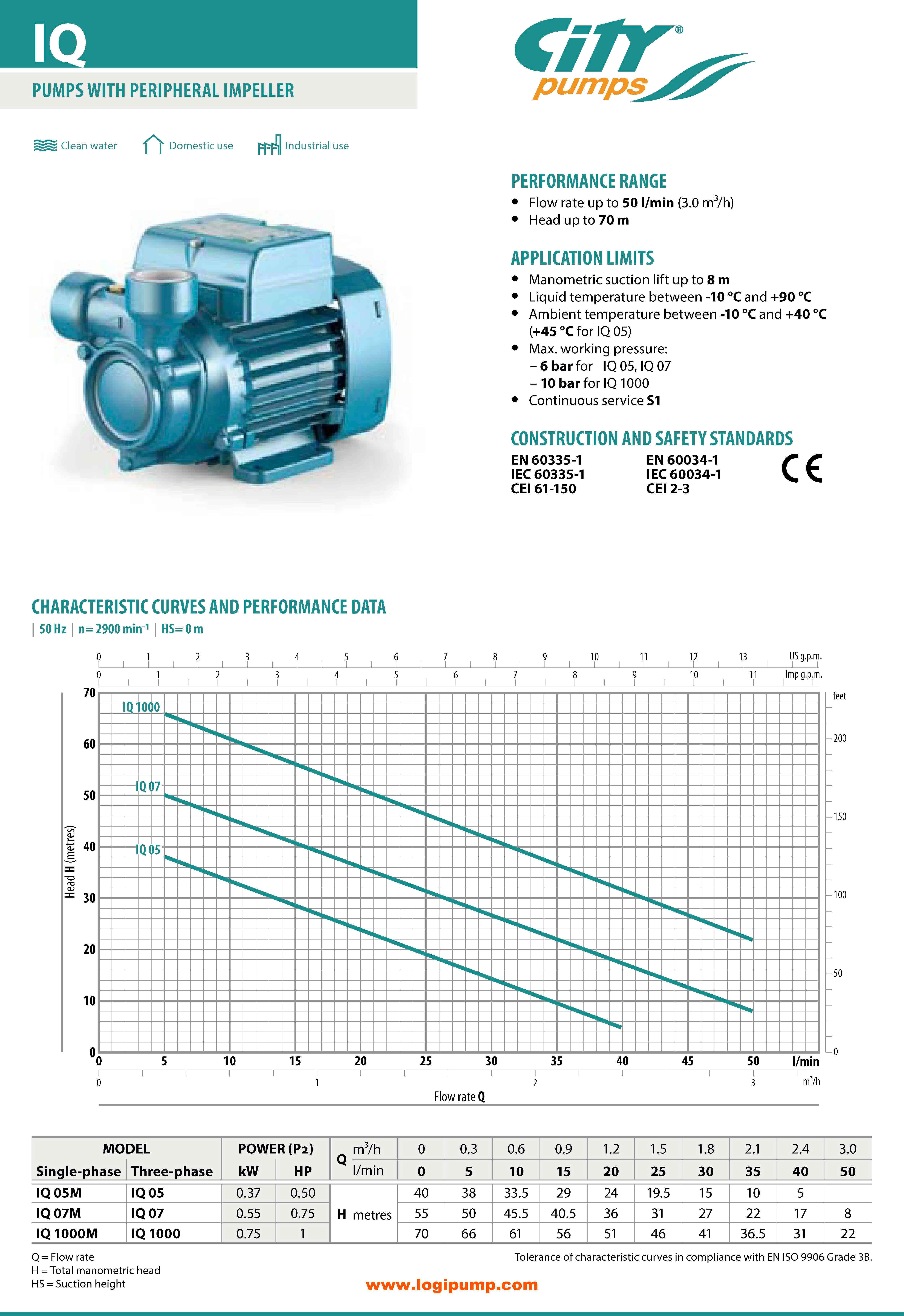 Periferik çarklı pompa. Temiz su için ev ve endüstriyel kullanım. Debi 50 l/dk (3 m³/sa), basma yüksekliği 70 m. Emiş yüksekliği 8 m, sıvı sıcaklığı -10°C ila +90°C. Döküm gövde, pirinç çark. | CTY_IQ 05: IQ serisi pompa 3 m³/saat debi ve 70 m basma yüksekliğiyle ev, tarım ve endüstriyel temiz su transferinde çalışır. 90°C'ye kadar sıvı sıcaklığı ve 8 m emiş mesafesi sağlar. Made in İtaly | Pedrollo PQ Serisi Alternatifidir 0.37 kW - 40 mSS