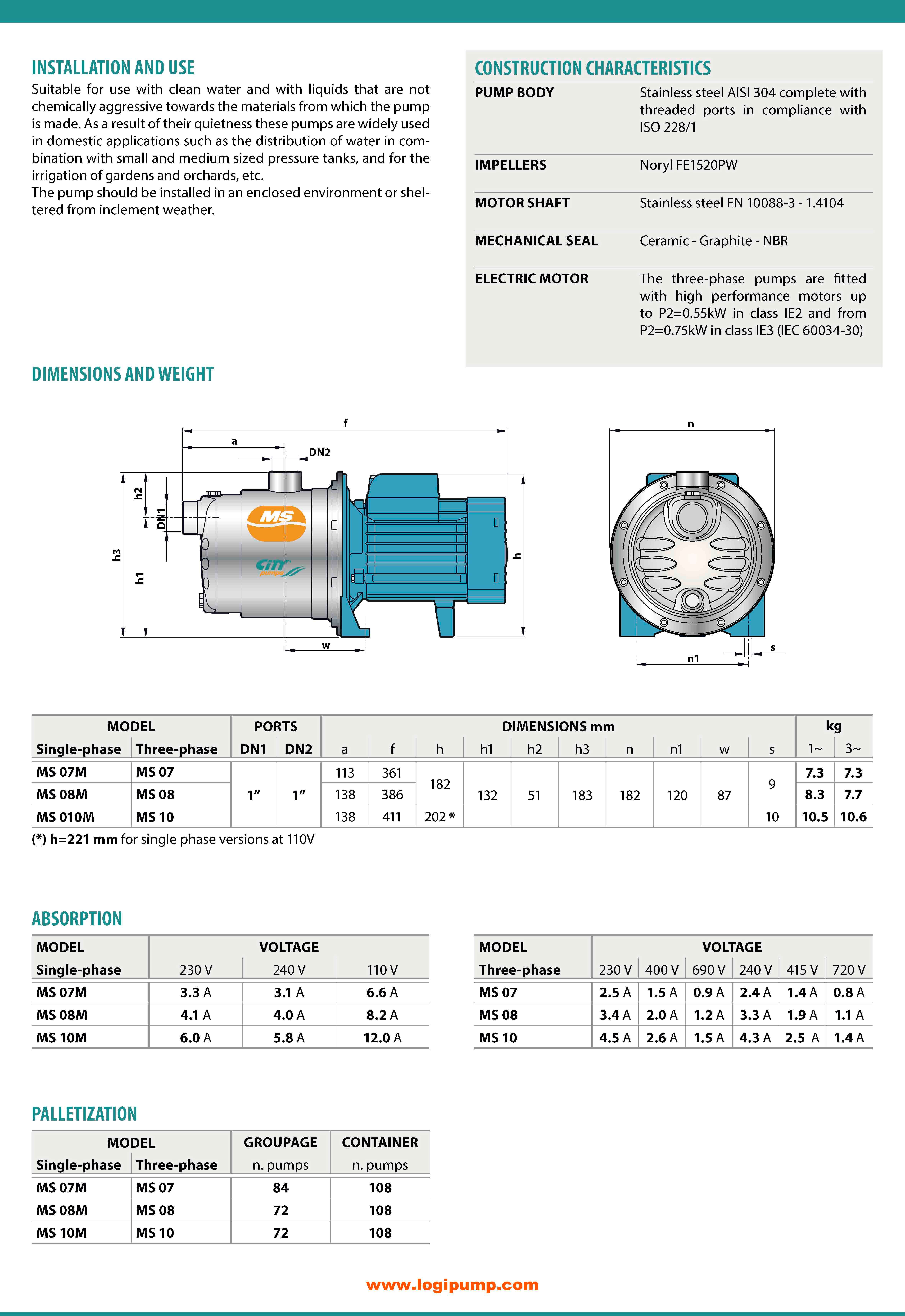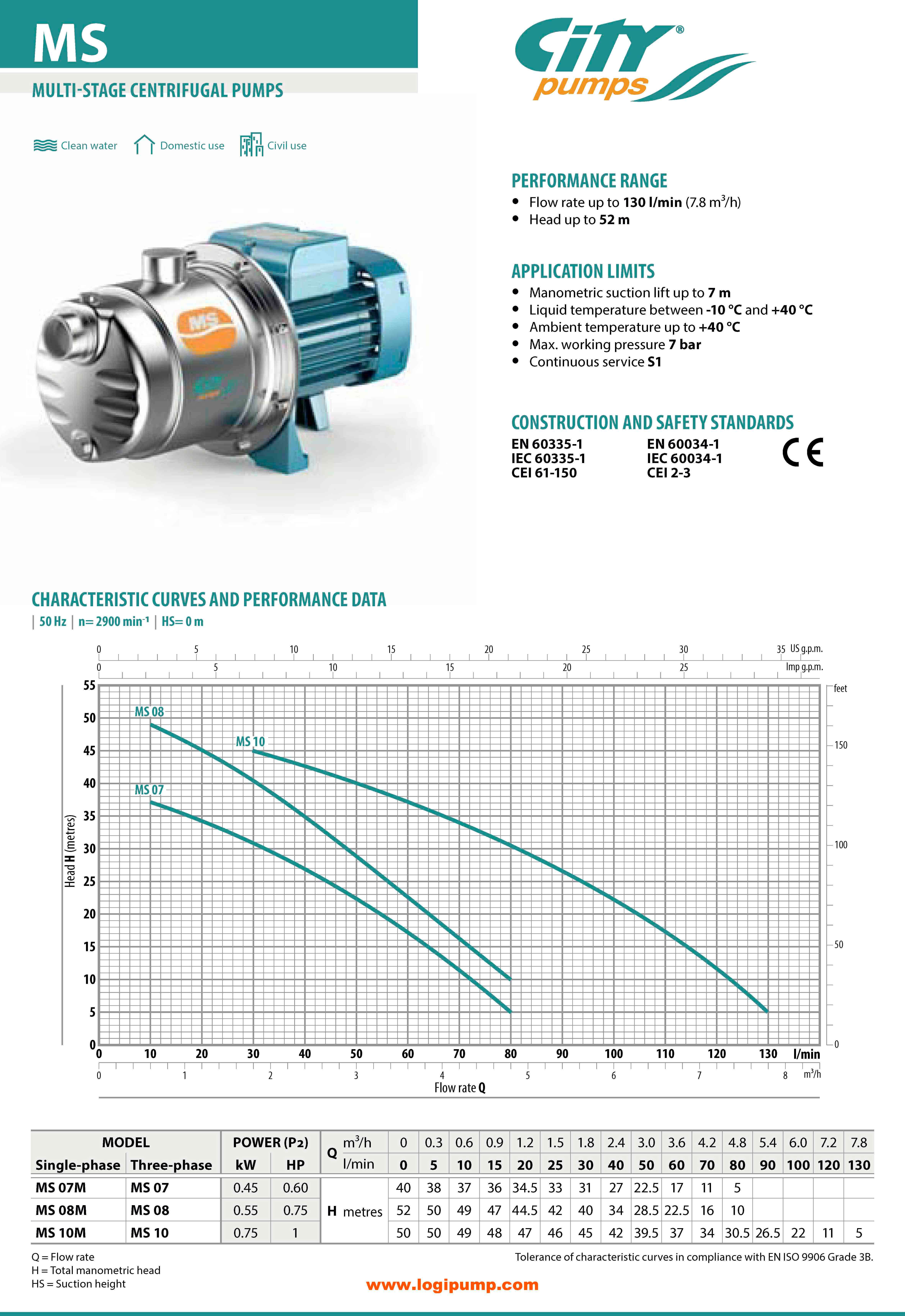 Paslanmaz çok kademeli santrifüj pompa. Temiz su için ev ve sivil. Debi 130 l/dk (7.8 m³/sa), basma yüksekliği 52 m. Emiş yüksekliği 7 m, sıvı sıcaklığı -10°C ila +40°C. Paslanmaz gövde, Noryl çarklar. | CTY_MS 07: MS paslanmaz pompa 7.8 m³/saat debi ve 52 m basma yüksekliğiyle uzun ömürlü hidrofor ve temiz su sistemlerinde çalışır. Made in İtaly | Pedrollo 3-5CR Serisi Alternatifidir 0.45 kW - 40 mSS