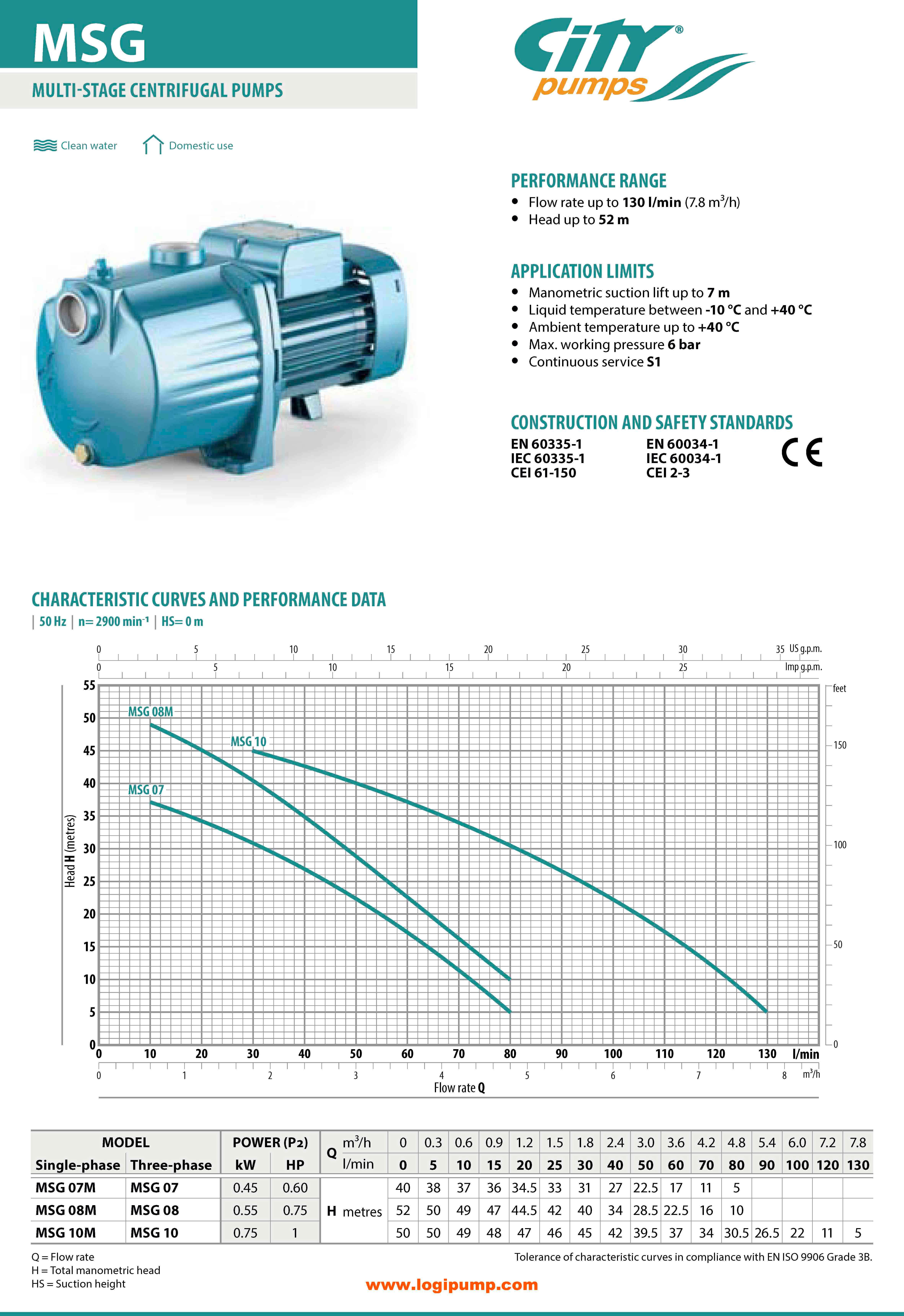 Çok kademeli santrifüj pompa. Temiz su için sessiz ev kullanımı. Debi 130 l/dk (7.8 m³/sa), basma yüksekliği 52 m. Emiş yüksekliği 7 m, sıvı sıcaklığı -10°C ila +40°C. Döküm gövde, Noryl çarklar. | CTY_MSG 08: MSG çok kademeli pompa 7.8 m³/saat debi ve 52 m basma yüksekliğiyle apartman hidrofor ve sessiz su dağıtım sistemleri için idealdir. Made in İtaly | Pedrollo 4CP Serisi Alternatifidir 0.55 kW - 52 mSS
