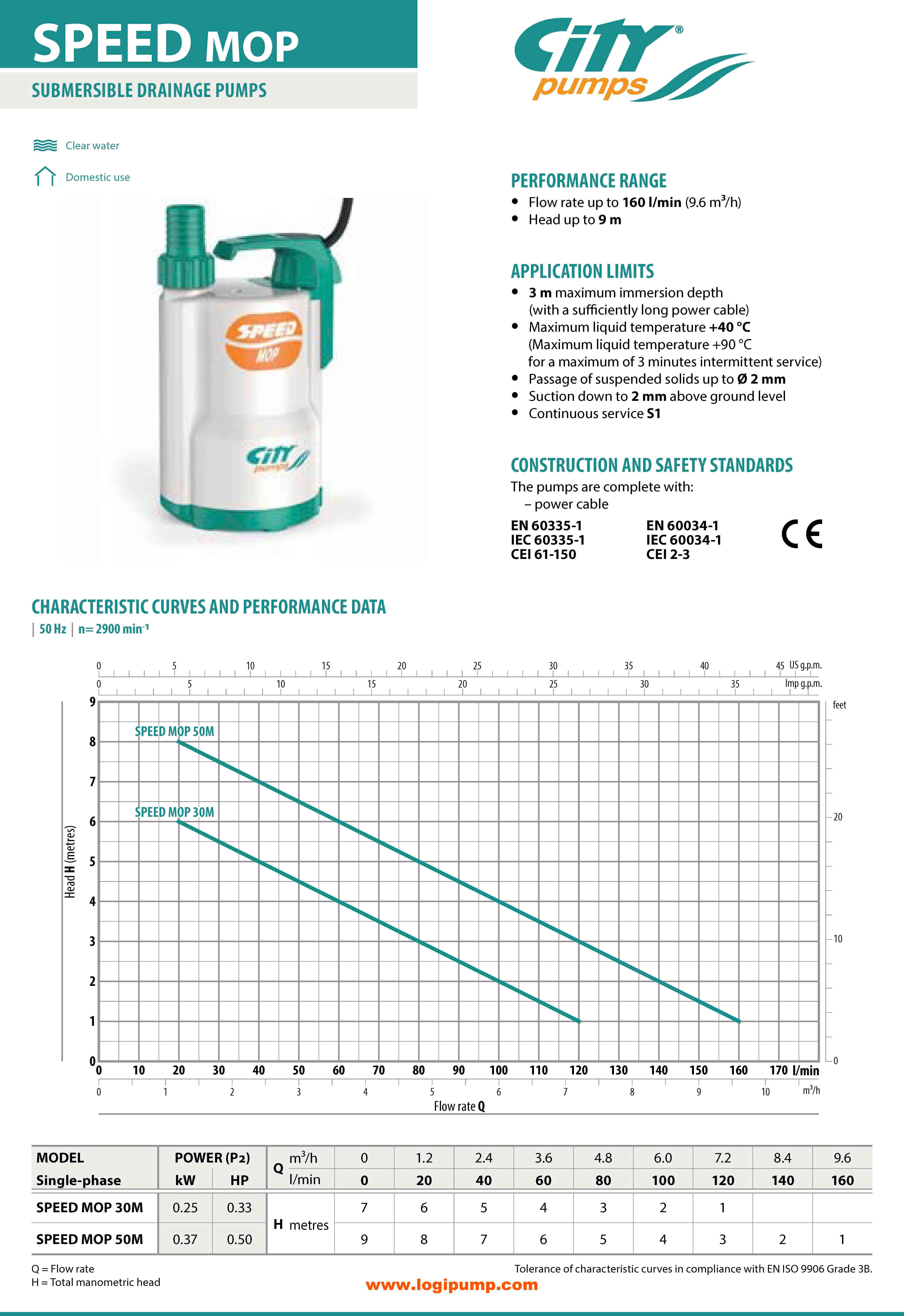 City Pumps SPEED MOP 50M 2 mm Seviyeye Kadar Drenaj Pompası Sel Tahliyesi İçin 0.37 kW - 9 mSS (CTY_SPEED MOP 50M)