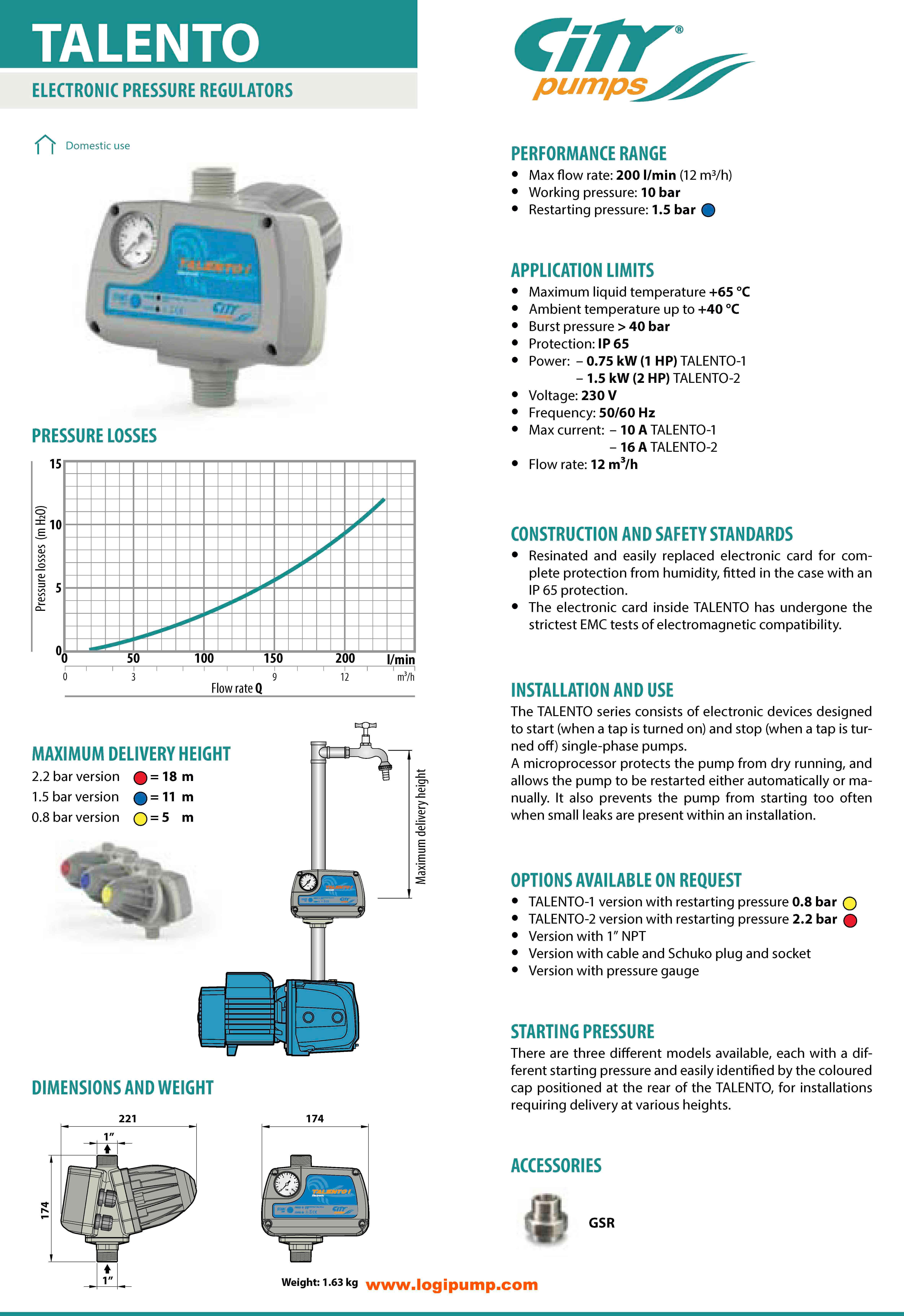 2 HP'ye kadar pompa için elektronik basınç regülatörü. Maks. debi 200 l/dk, 10 bar, kuru çalışmaya karşı koruma. | CTY_TALENTO-1 HP: TALENTO akıllı regülatör pompayı otomatik çalıştırır, kuru çalışmayı önler, hidrofor yerine geçer. Made in İtaly | Pedrollo Serisi Alternatifidir kW - mSS