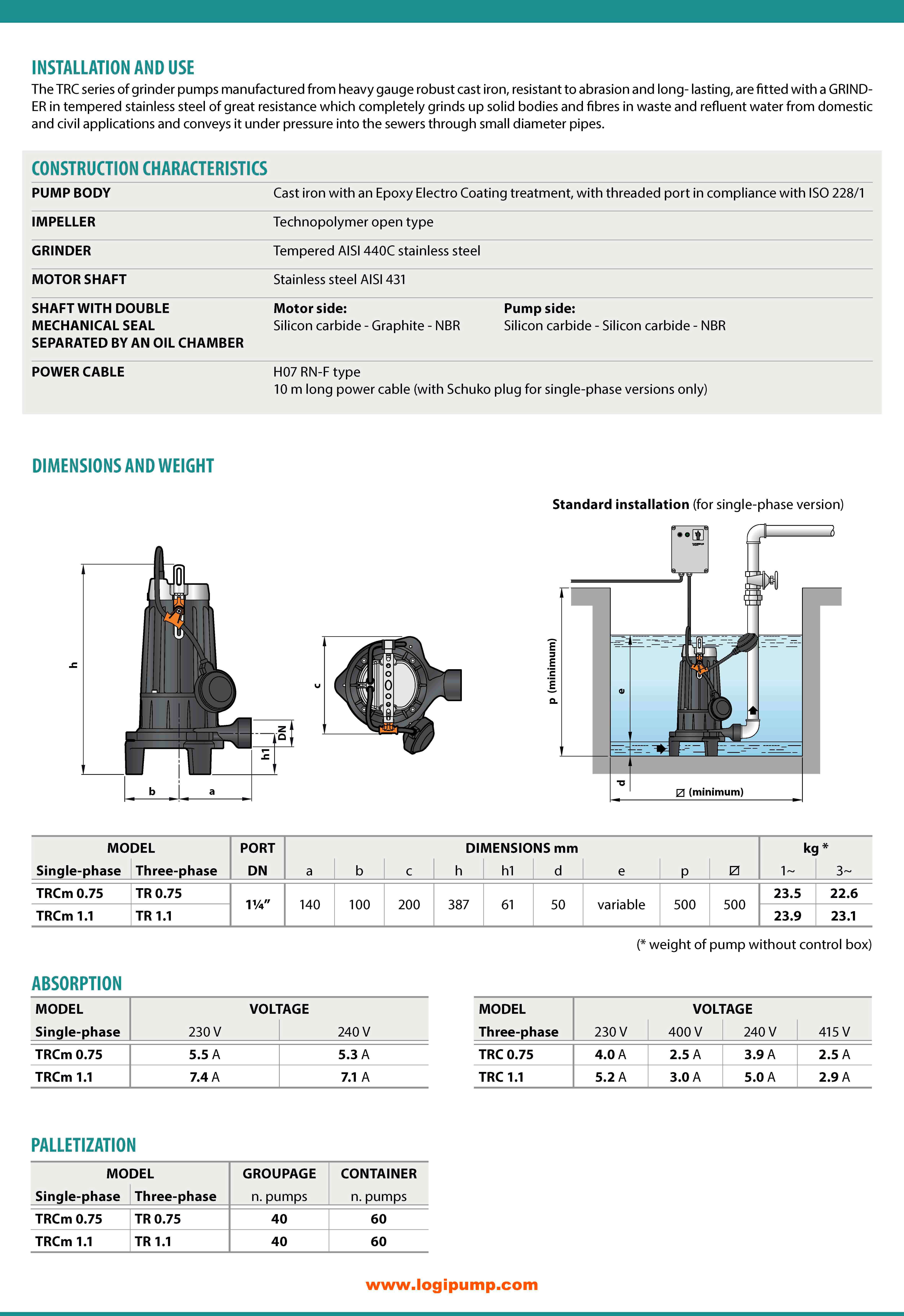 Parçalayıcılı pis su dalgıç pompa. Debi 220 l/dk (13.2 m³/sa), basma yüksekliği 23 m. Daldırma derinliği 10 m. Paslanmaz öğütücü. | CTY_TRC 1.1: TRC öğütücülü pompa 13.2 m³/saat debi ile lifli, katı atık içeren fosseptik tahliyesinde ince boruya basar. Made in İtaly | Pedrollo TRITUS Serisi Alternatifidir 1.1 kW - 23 mSS