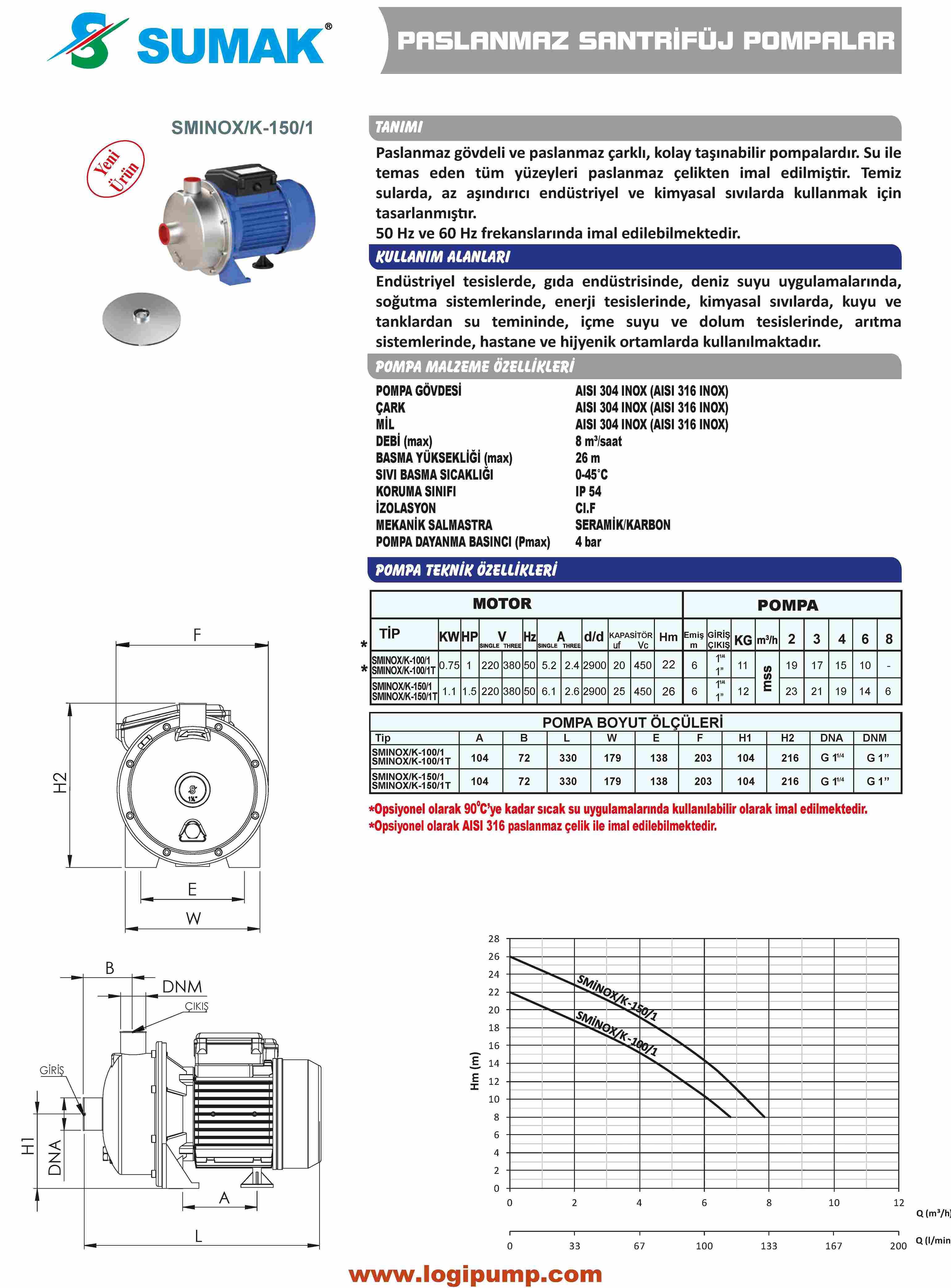 SUMAK SMINOX/K-100/1 Aısı 304 Kapalı Çarklı Pompa | 0.75 kW - 220 V SUMAK SMINOX/K-100/1T Aısı 304 Kapalı Çarklı Pompa | 0.75 kW - 380 V SUMAK SMINOX/K-150/1 Aısı 304 Kapalı Çarklı Pompa | 1.1 kW - 220 V